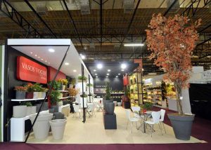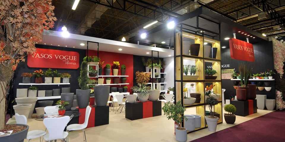 Stand construído, com piso sem elevação, mdf madeirado, revestimento em napa, contendo prateleiras e cubos expositores.