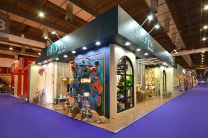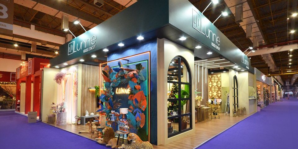 Stand construído, formato esquina, piso sem elevação, com revestimento em mdf madeirado, áreas para exposição, iluminação e cenários.