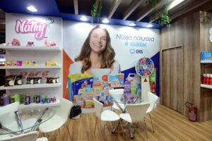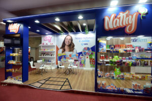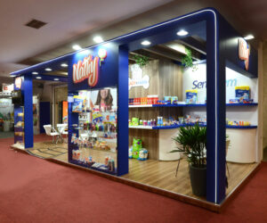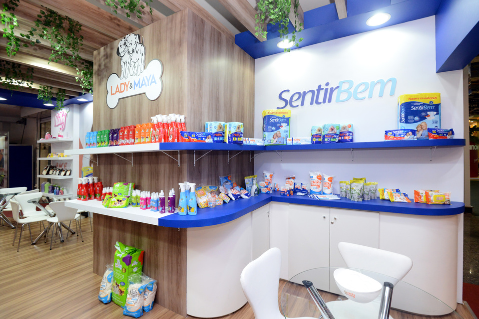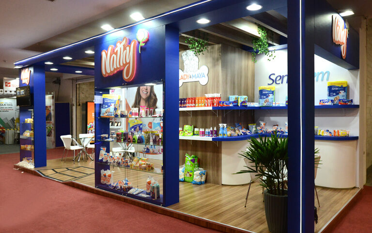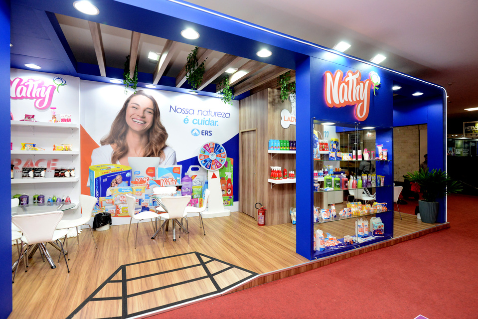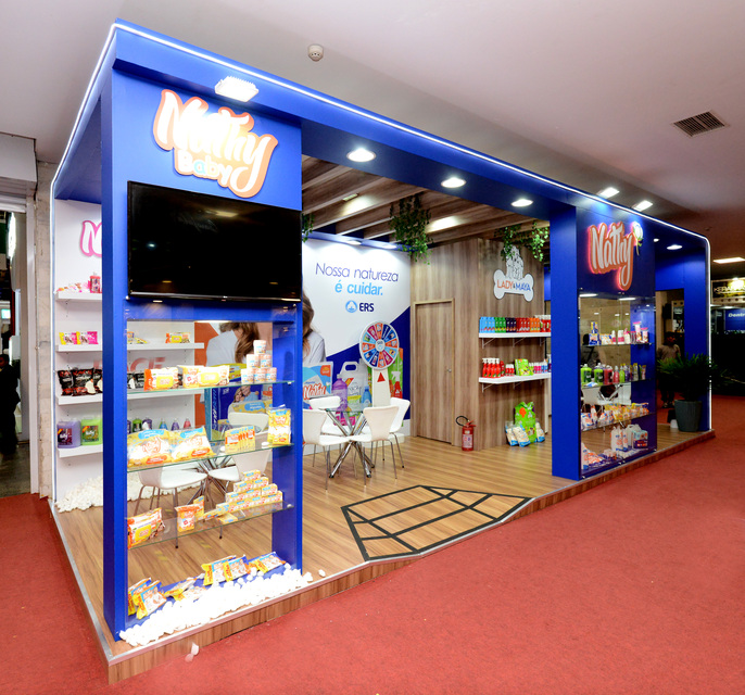 , Stand construído, formato esquina, piso elevado com revestimento em mdf madeirado, contendo prateleiras e vitrines para exposição, além de decoração com led, logo com led e paisagismo.