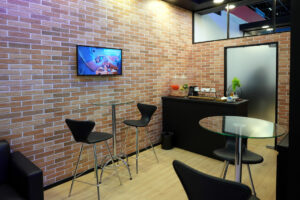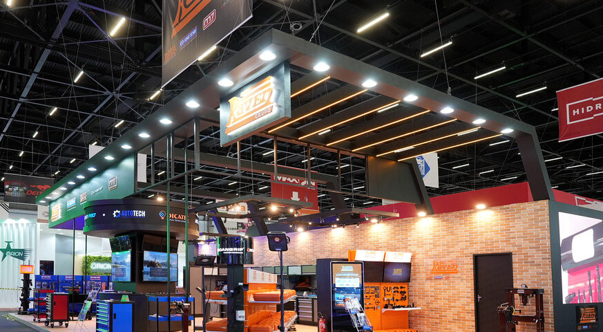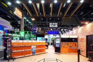 Stand construído, formato ponta de ilha, piso elevado com revestimento em mdf madeirado, testeira suspensa com cabos aéreos, logomarcas com led, decoração de led, além de painel de led curvo, tvs touch e área para exposição de produtos.