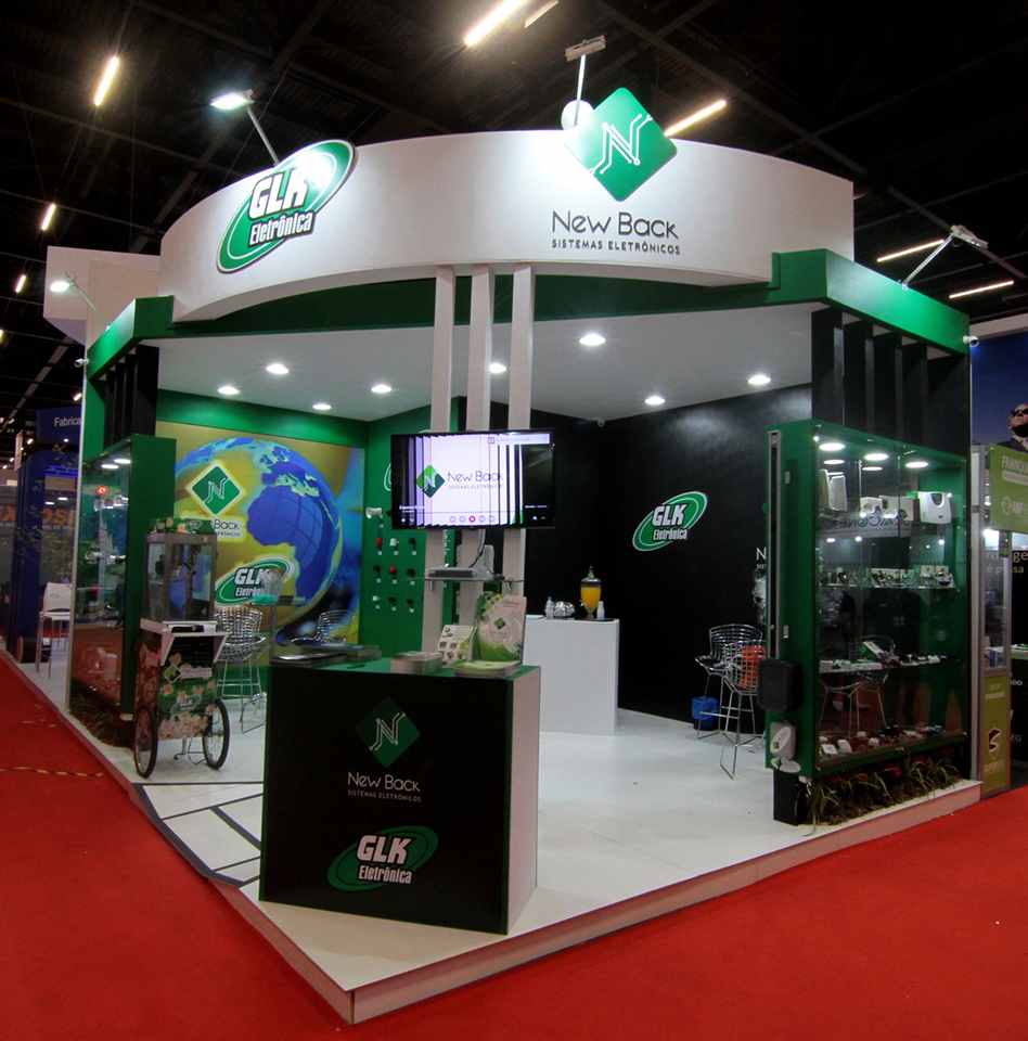Stand construído, com piso elevado revestido com mdf branco, contendo vitrines, balcões e Tv.