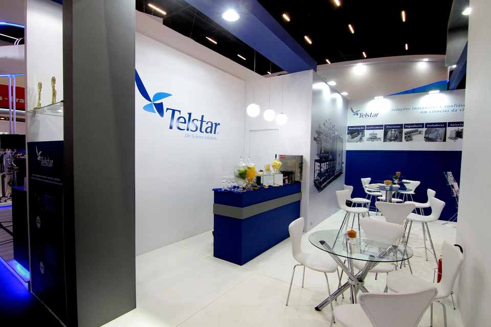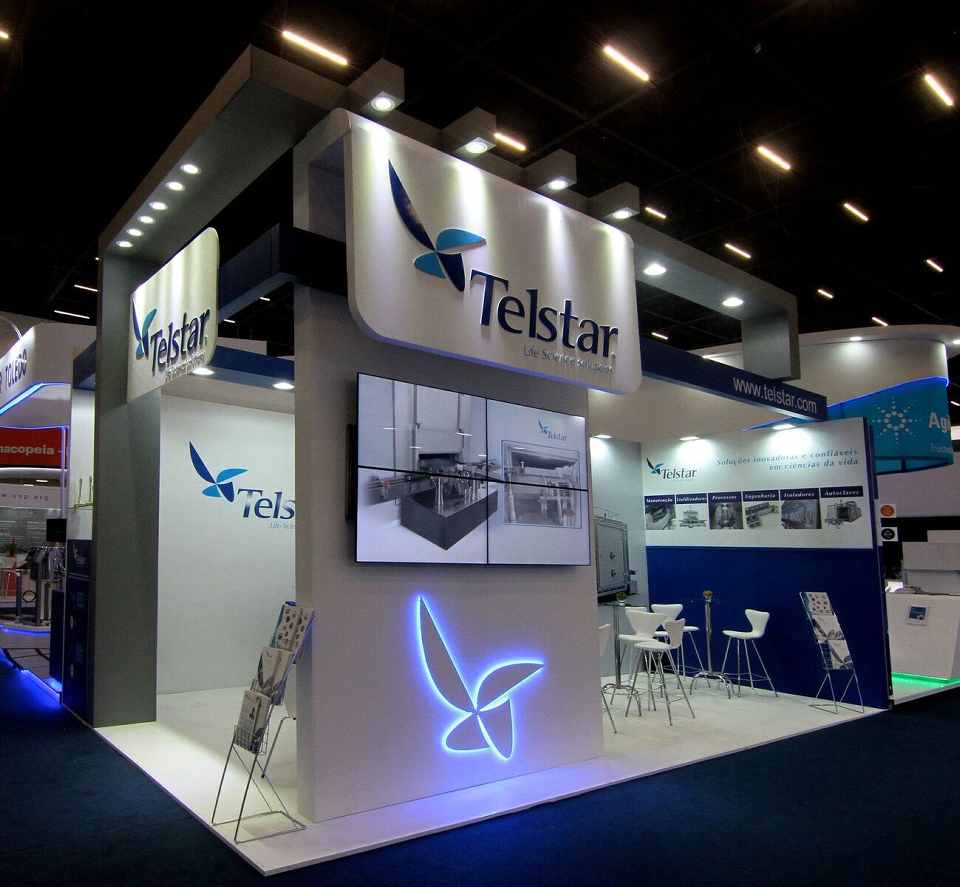 Stand construído, sem piso elevado, mdf branco, detalhe de logo em led, video wall, imagens, depósito e área de atendimento.
