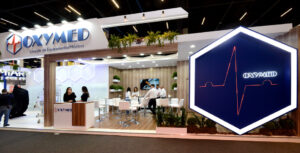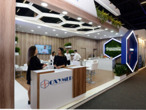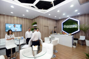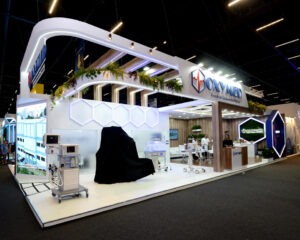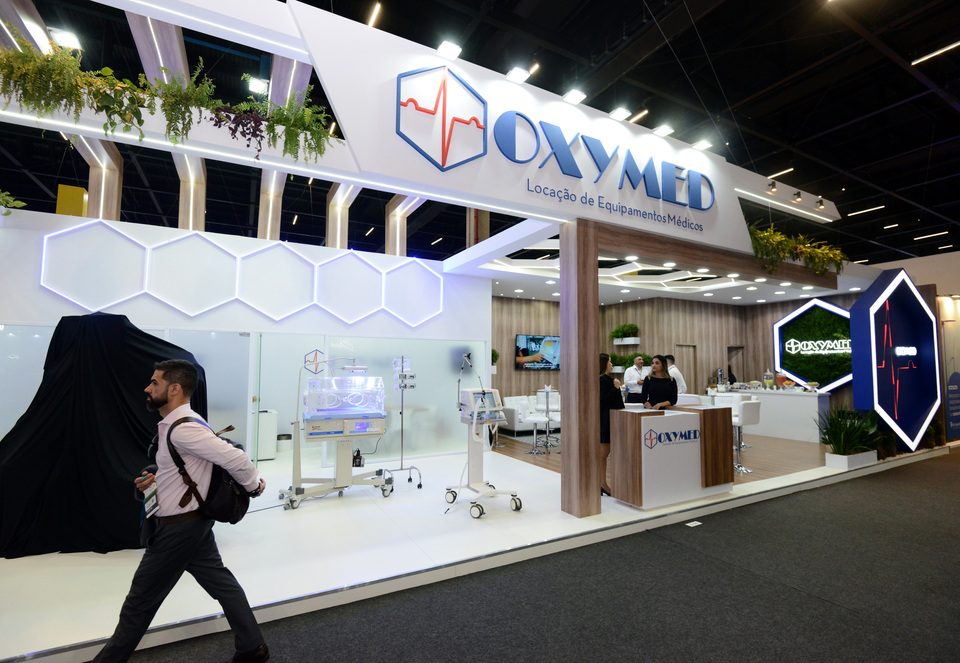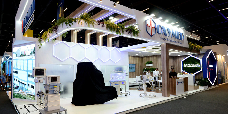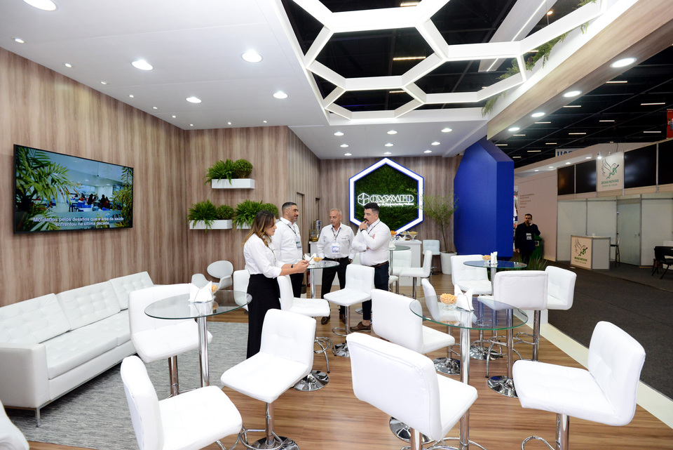 Stand construído, fomato esquina, piso elevado com revestimento em mdf branco e madeirado, estrutura suspensa com cabos aéreos contendo logomarcas e paisagismo, além de salas de reunião, depósito, copa, área de atendimento, painel de led e área instagramável.