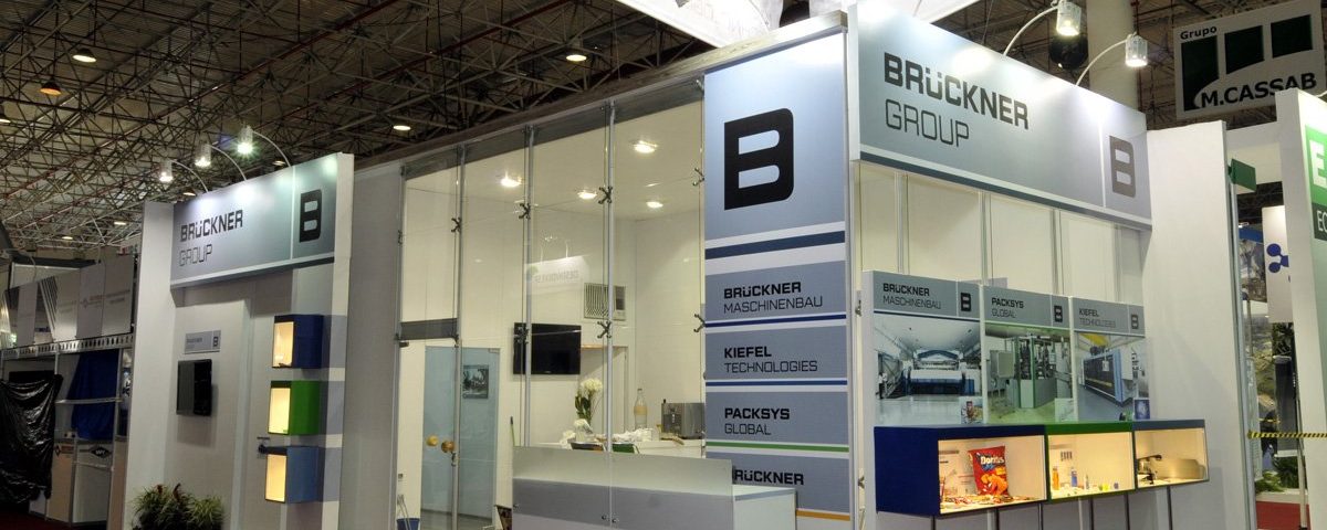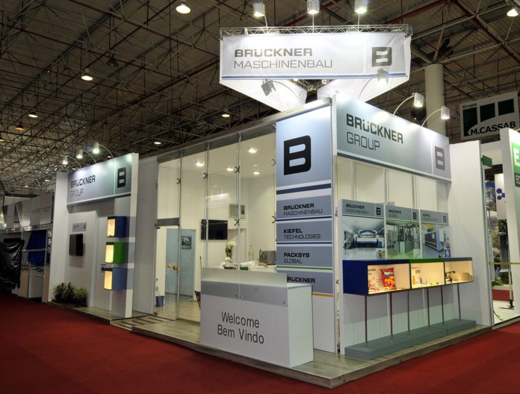 Stand ESQUINA - Modelo misto com MDF madeirado no piso e revestimentos em napa na cor branco, além de logomarcas em impressão digital, sala de reunião, copa, vitrines com iluminação embutida e estrutura suspensa no teto do pavilhão.