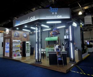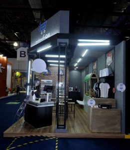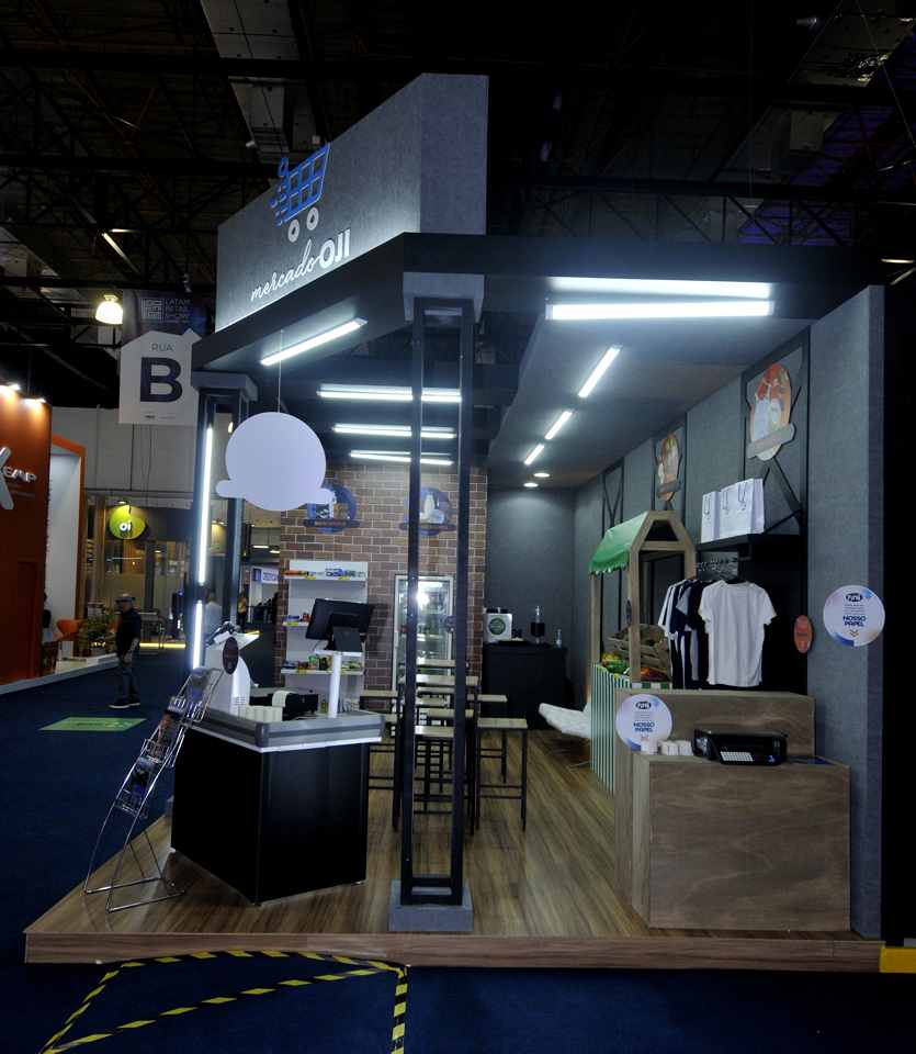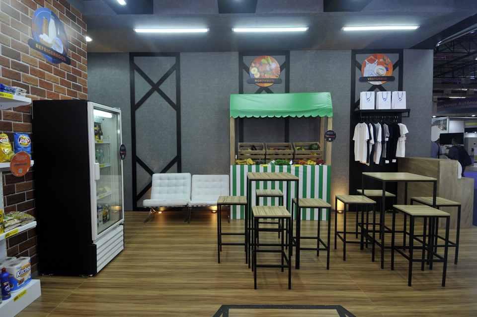Stand construído, esquina, com piso elevado, mdf madeirado, imagens tijolinho e cimento queimado, estrutura metálica com iluminação, demonstração hortifrúti, vestuário, check out, supermercado além de video wall .