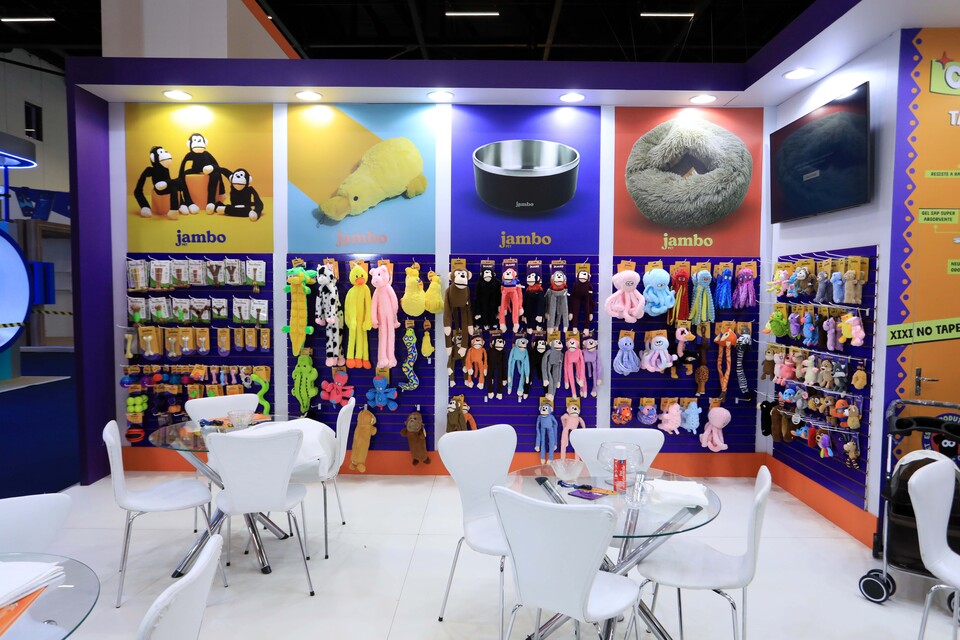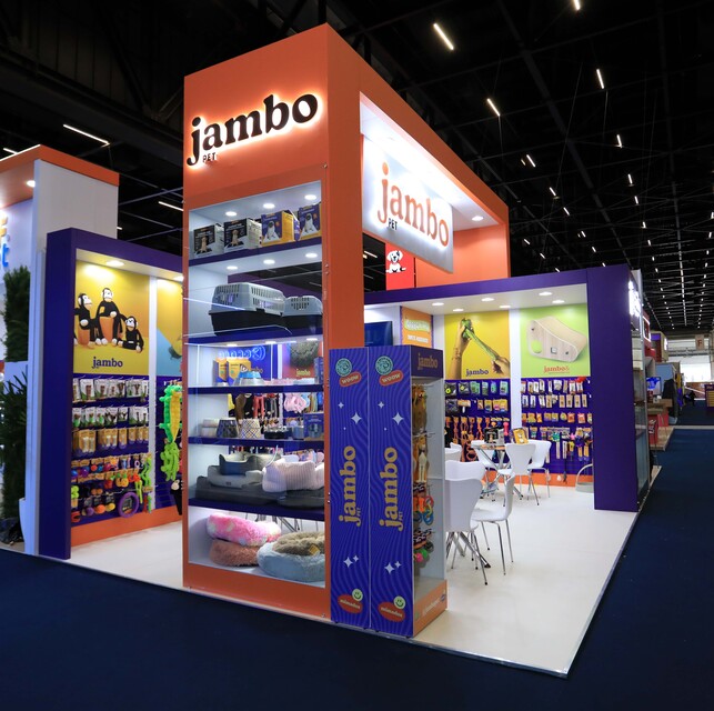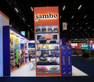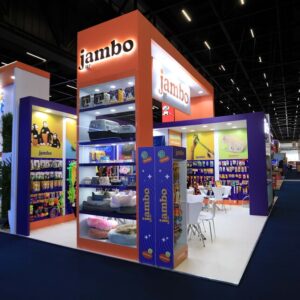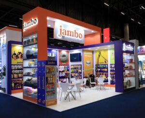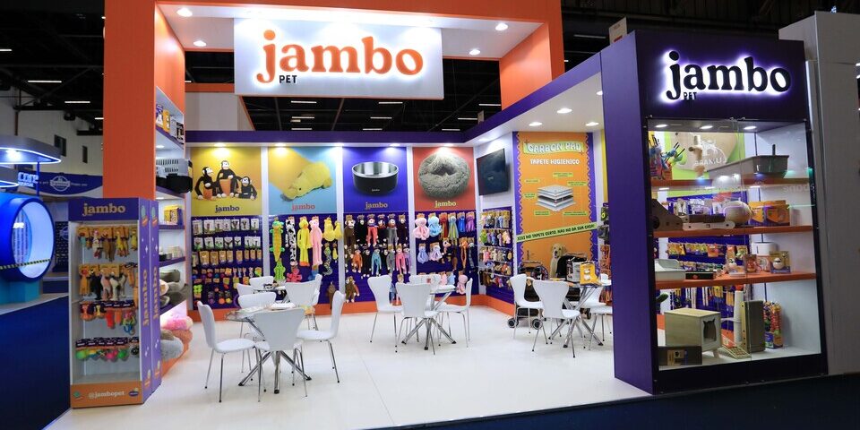 , Stand construído, formato esquina, piso sem elevação com revestimento em mdf branco, logomarcas com led, prateleiras e slat wall para exposição.