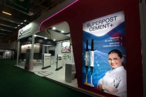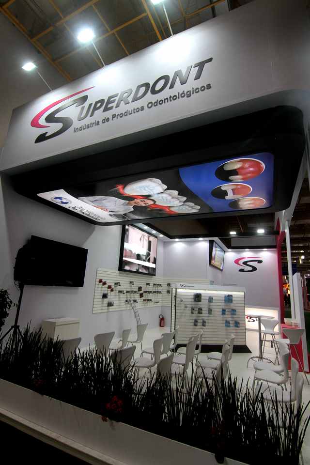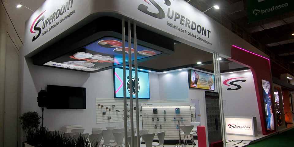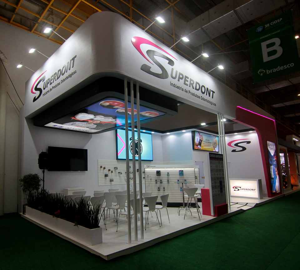 Stand construído, formato esquina, com piso elevado revestido em mdf branco, aplicação de imagens e painel de led.
